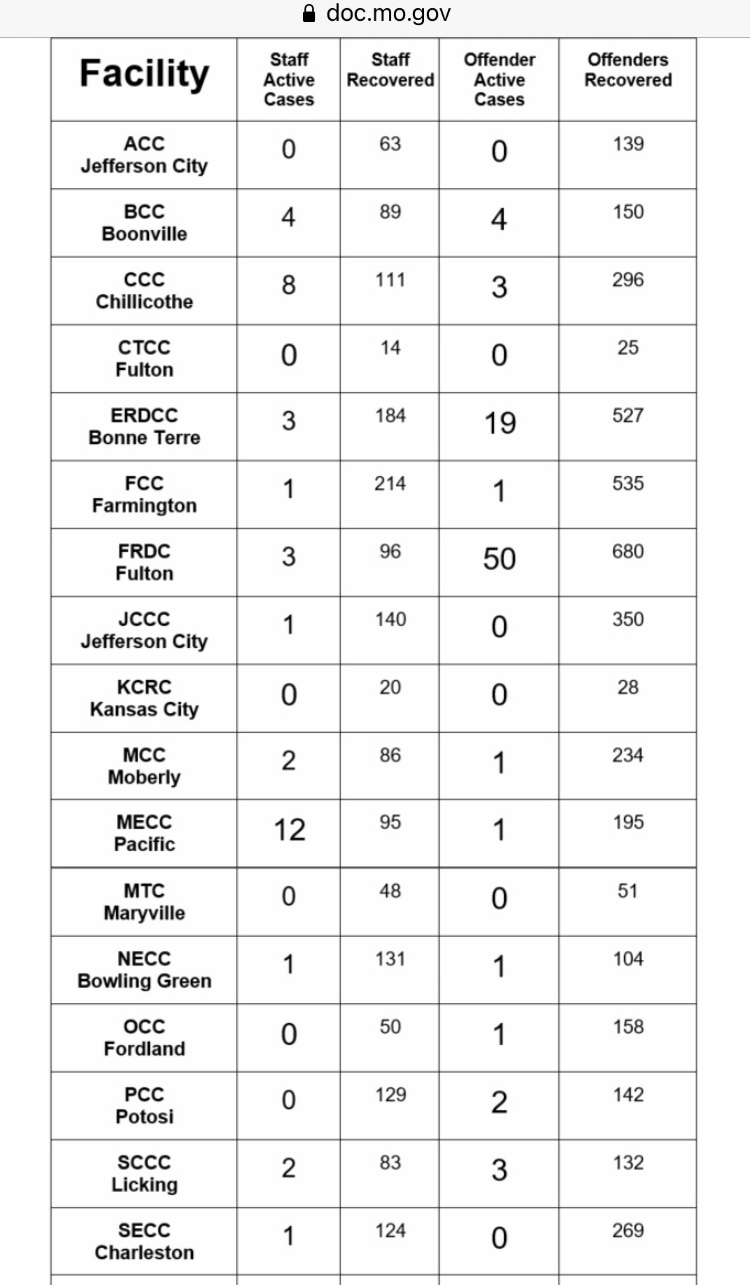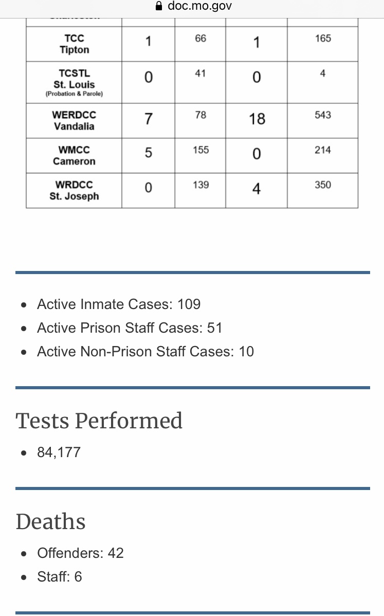 According to MoDOC’s website, there are now 109 active COVID cases amongst the incarcerated population today, opposed to the 89 they showed yesterday. https://doc.mo.gov/media-center/newsroom/covid-19/data