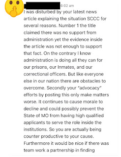 This morning we received a message from a central office employee who seems to be extremely out of touch with front-line staff as well as the incarcerated. The term “brain-washed” often comes to mind with central office employees. And we had to as this woman if she even read the article (https://m.riverfronttimes.com/newsblog/2021/02/02/officers-inmates-call-for-change-after-missouri-prison-melee).