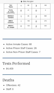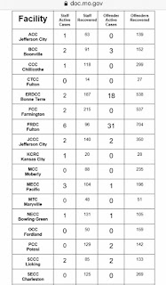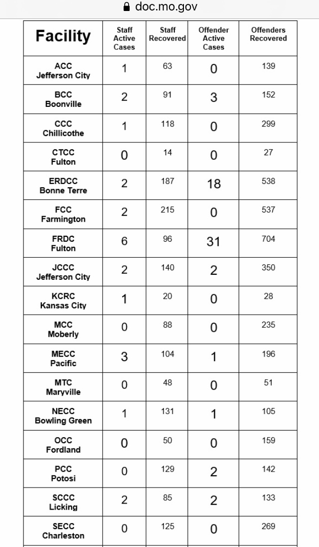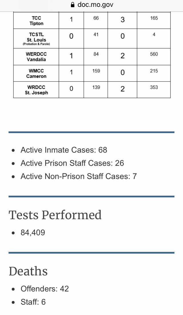 Here are today’s COVID-19 numbers for MoDOC facilities according to their website. There’s a small increase in both incarcerated and staff numbers. https://doc.mo.gov/media-center/newsroom/covid-19/data