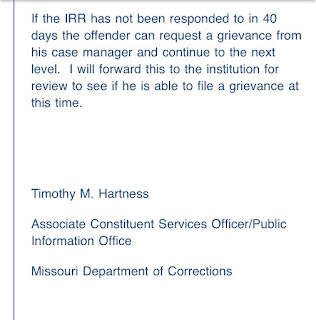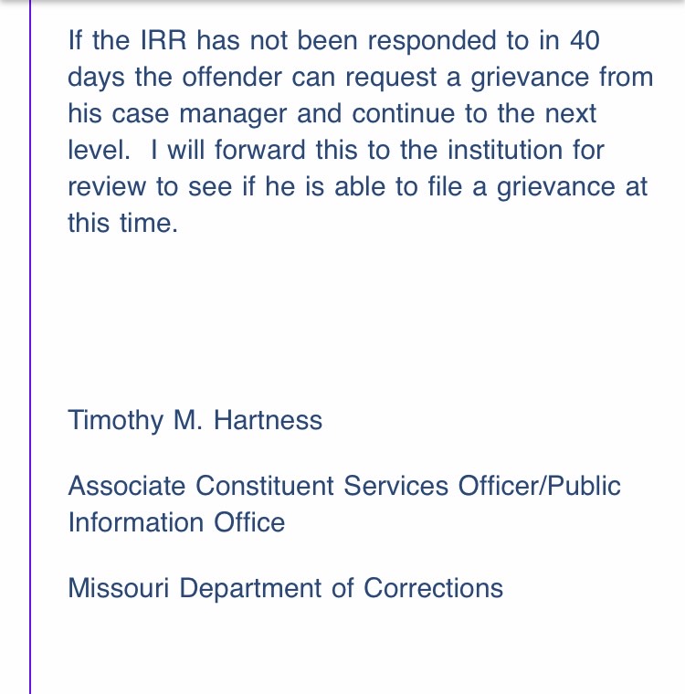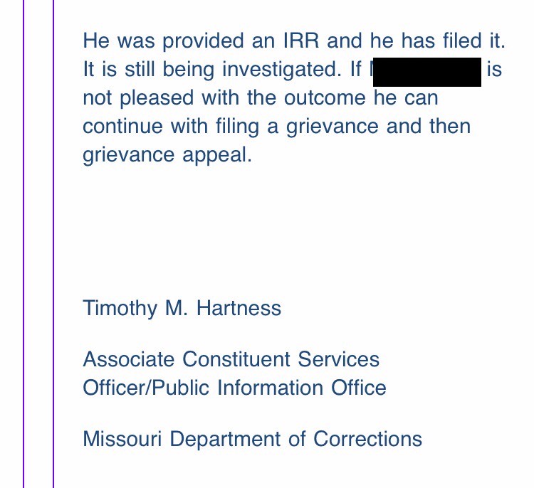 Several times this week constituent services has told her that her son should hear back on his IRR “soon”. We emailed the family member and included constituent services, informing the family that, per policy, the IRR must be reviewed within 40 days. If not, there must be a reason given and it must be provided to the individual who filed the IRR. The family member reminded them of this and only then did Mr. Hartness inform the family that if it had been more than 40 days, the man could file a grievance and state he would send it onto the facility. Did Mr. Hartness even bother looking at dates that this man filed IRR’s regarding this issue before telling the family, more than once, that he would hear back “soon”?