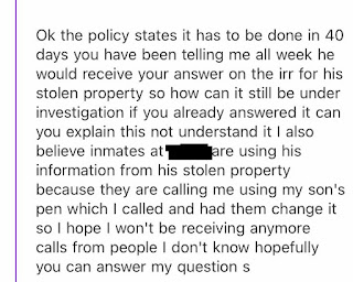 An incarcerated man filed an IRR well over a month ago regarding his stolen property. The family has made multiple calls to the facility and has emailed constituent services only to be ignored, to have the facility warden tell her that her son probably sold his property for drugs (without any evidence of this being the case) and many other issues.