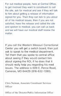 A family member of an incarcerated individual reached out to constituent services today regarding a medical issue that hasn’t been addressed by two different facilities. This is a response they got back. It is extremely hard to understand what Mr. Neiman is saying and it looks as if part of it has been copied and pasted because of the difference in font.