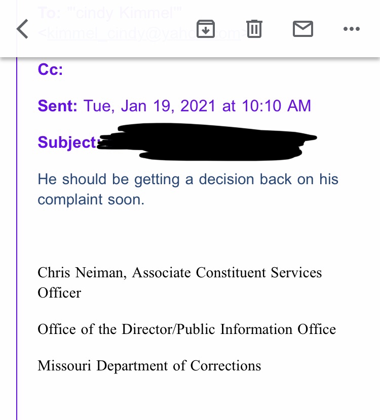 A family member of an incarcerated individual has tried multiple times (over a time period of almost two months) to get answers regarding several issues regarding the incarcerated individual. Facility staff don’t return calls, constituent services don’t return calls, the IRR has not been addressed. Today the family member sent a lengthy email to constituent services regarding these issues and this is the email she received back. What is the state paying these employees to do?