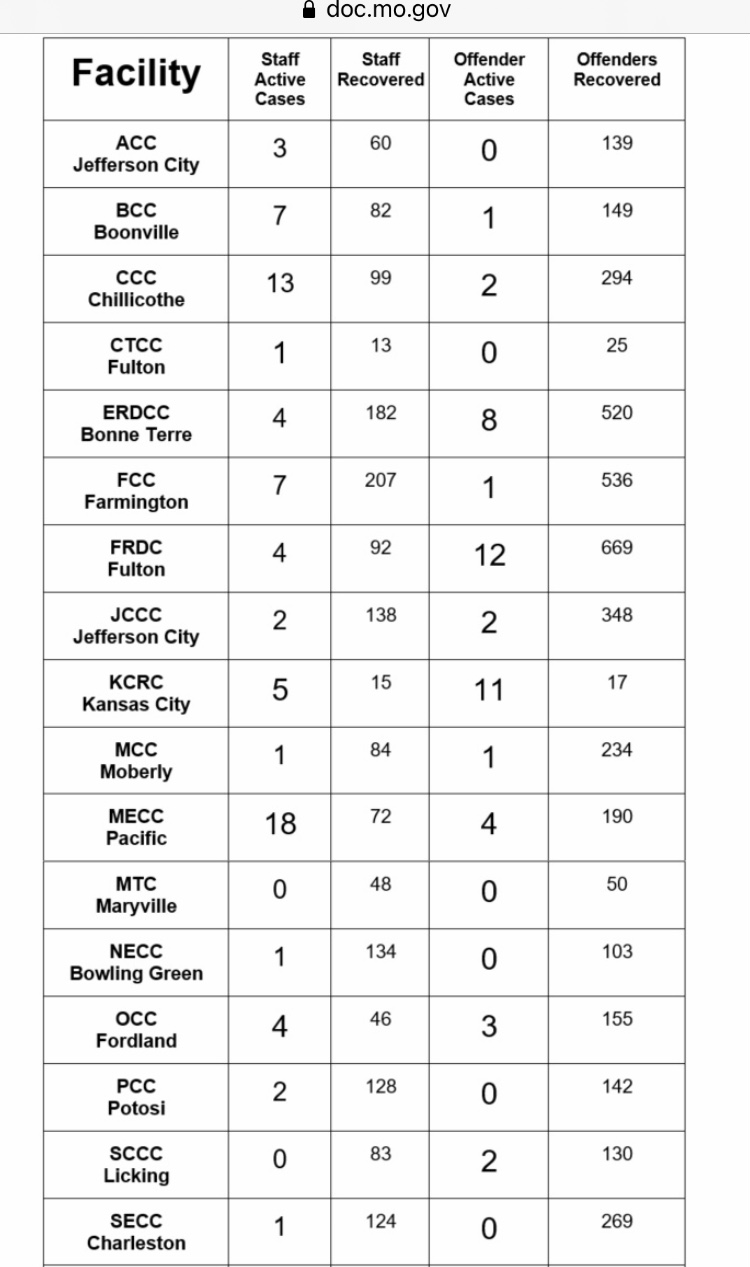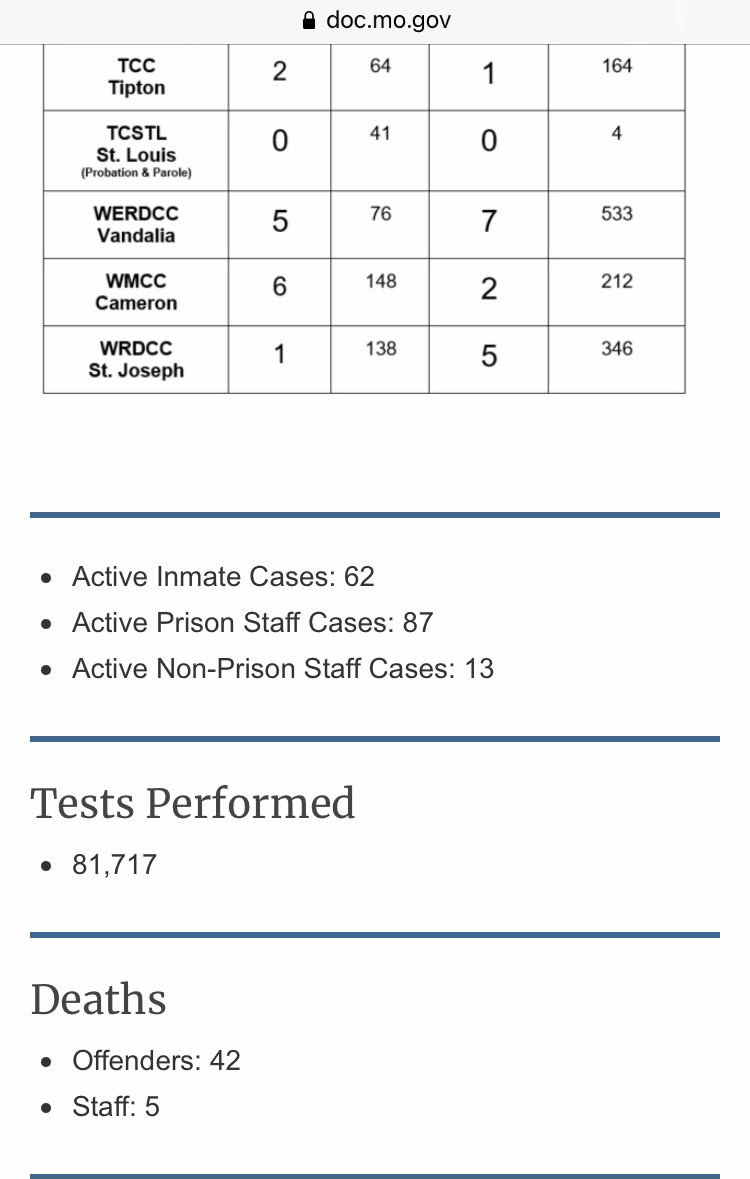 Here are MoDOC’s COVID-19 numbers for 1/22/21 according to their website. https://doc.mo.gov/media-center/newsroom/covid-19/