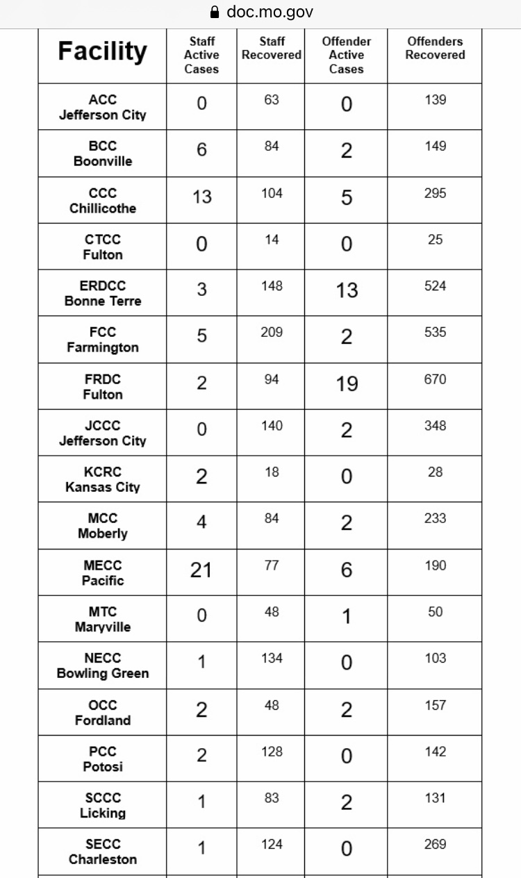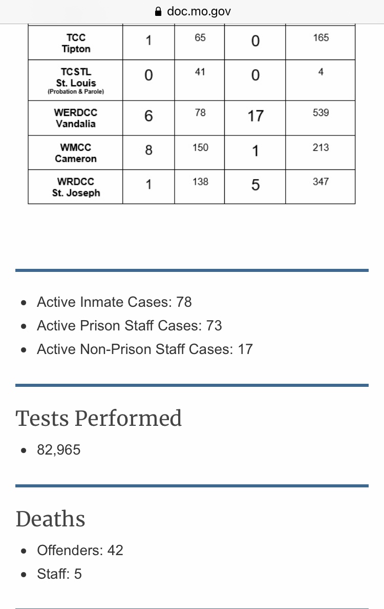 MoDOC has updated the COVID-19 data on their website. https://doc.mo.gov/media-center/newsroom/covid-19/data