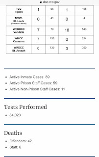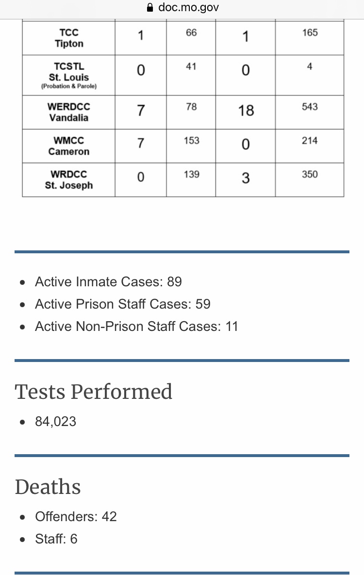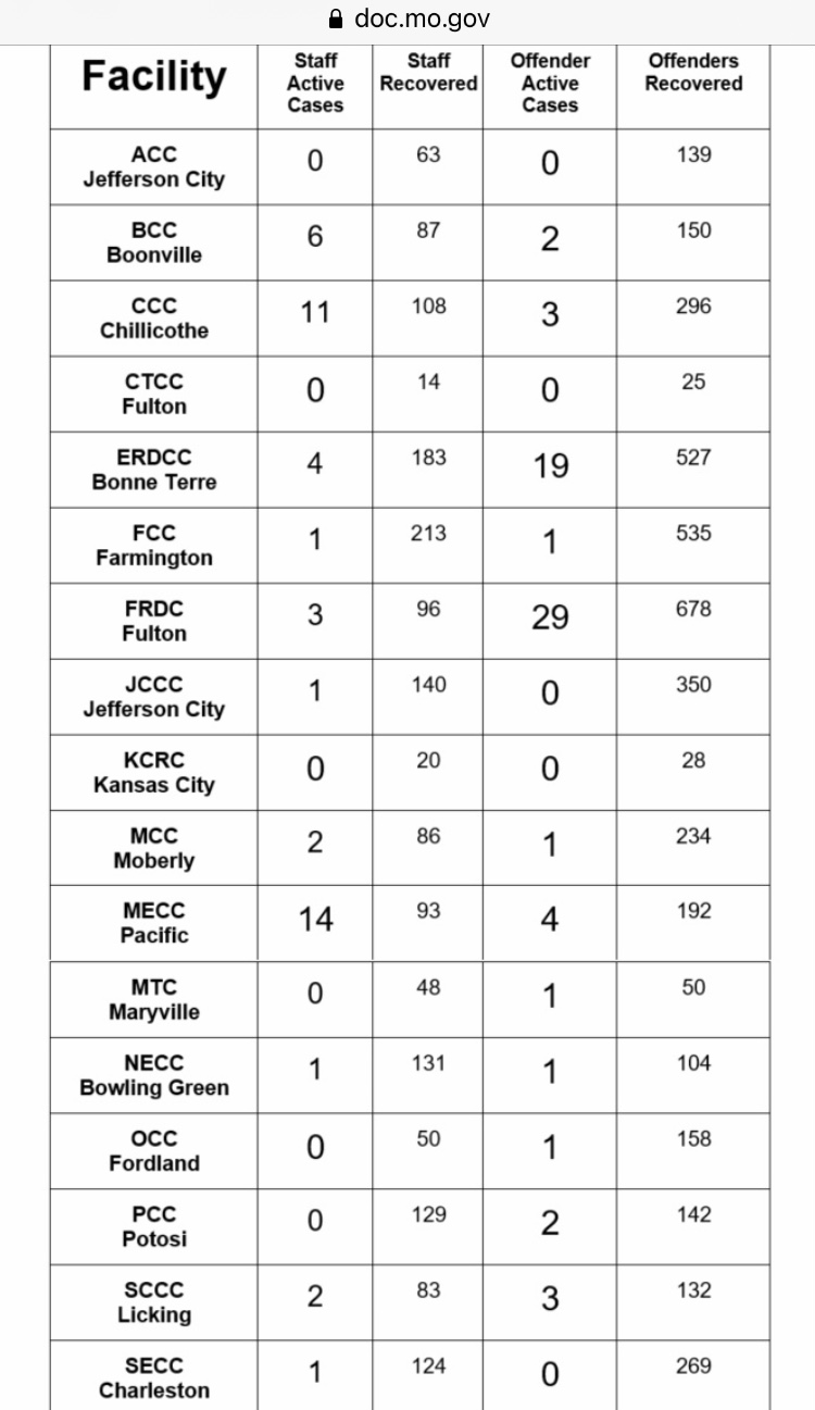 Here’s today’s COVID-19 update for MoDOC facilities per their website. https://doc.mo.gov/media-center/newsroom/covid-19/data