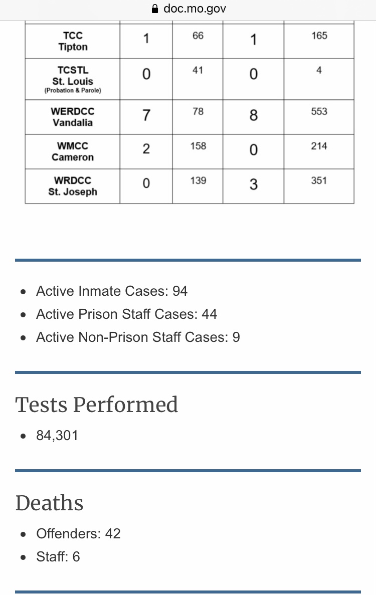 Here’s the Covid-19 update for today according to MoDOC’s website. https://doc.mo.gov/media-center/newsroom/covid-19/data