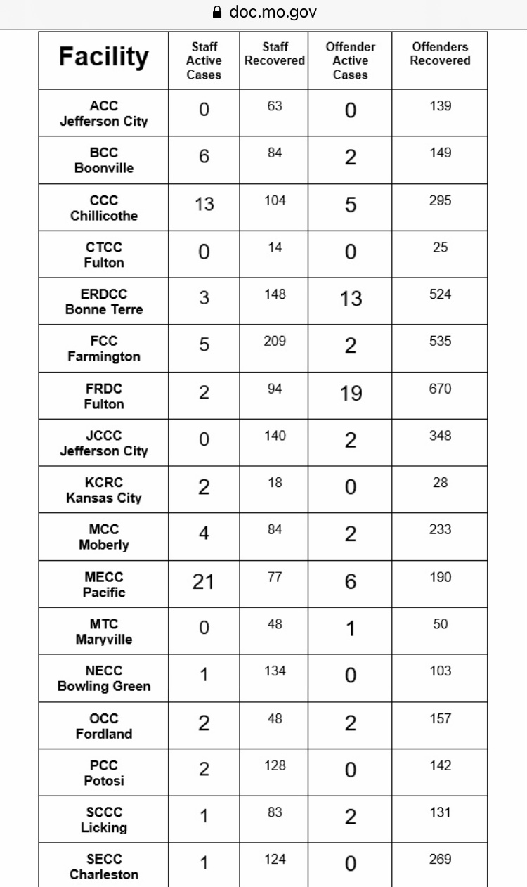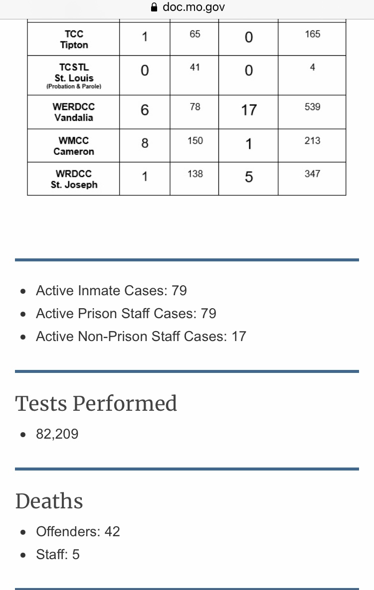 After not updating their COVID-19 data yesterday, MoDOC has updated their data this morning. According to them, staff and incarcerated positive cases have decreased slightly. https://doc.mo.gov/media-center/newsroom/covid-19/data