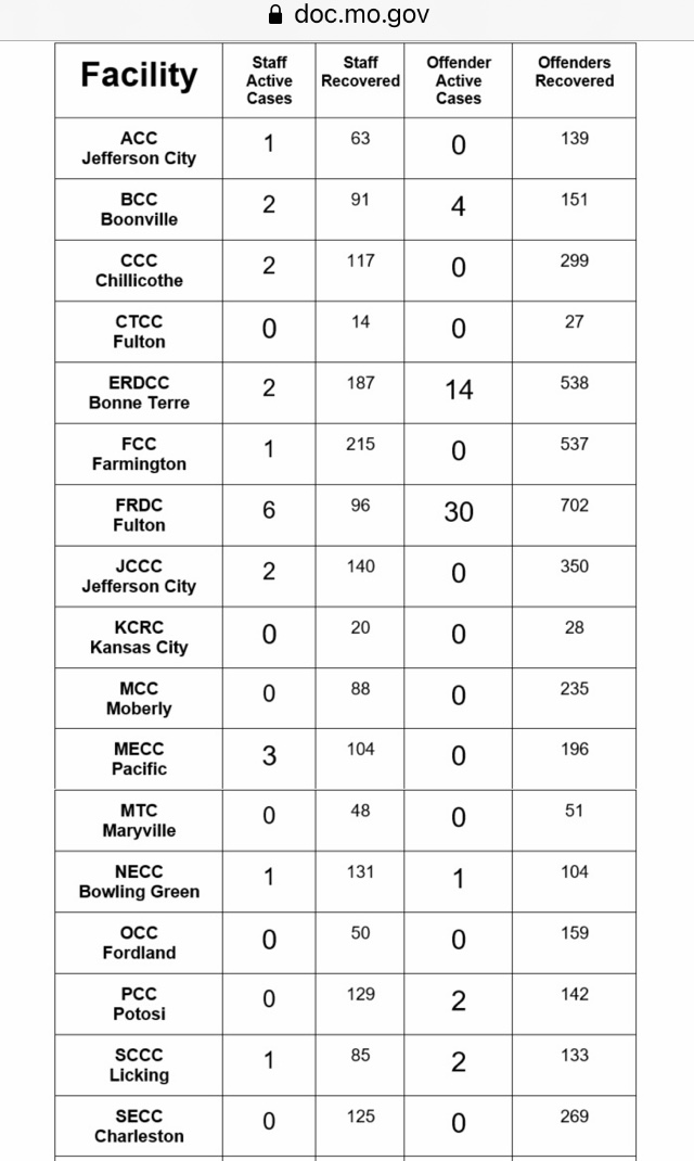 Here’s today’s COVID update for MoDOC facilities according to their website. https://doc.mo.gov/media-center/newsroom/covid-19/data