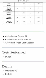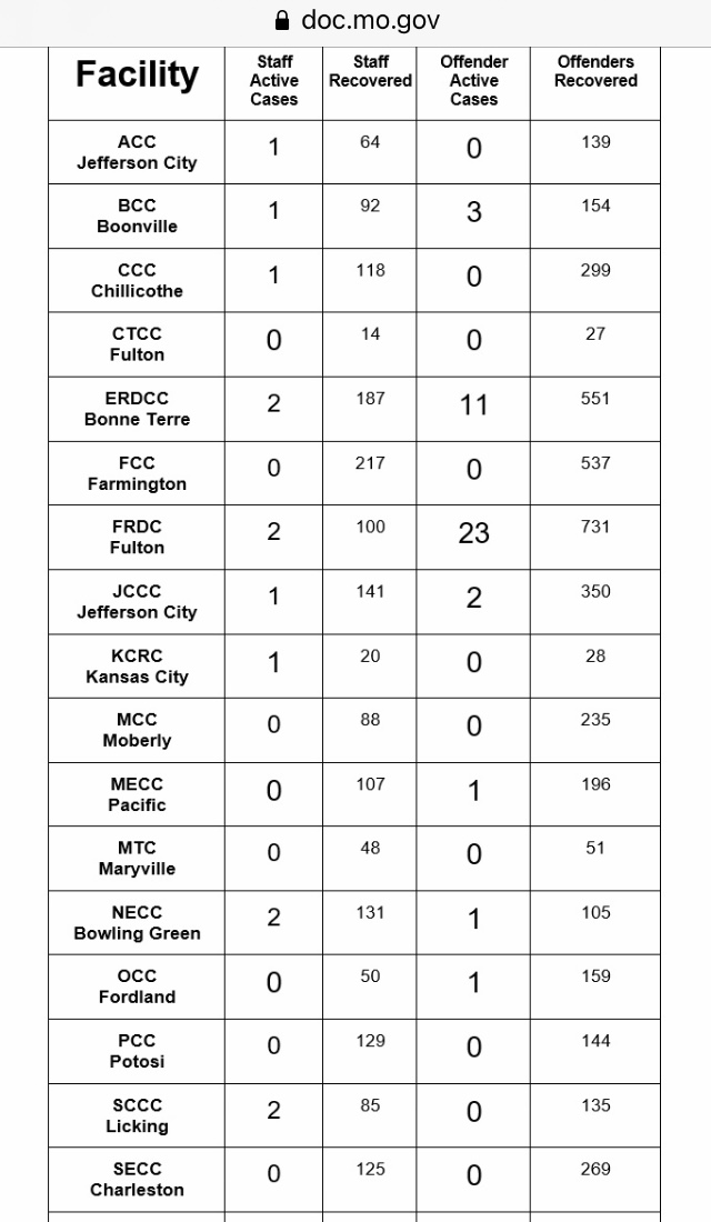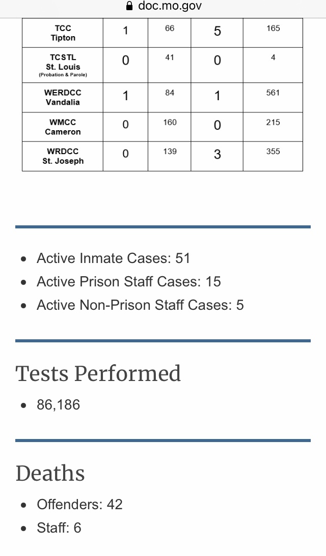 Here’s today’s Covid-19 update for MoDOC’s facilities according to their website. https://doc.mo.gov/media-center/newsroom/covid-19/data