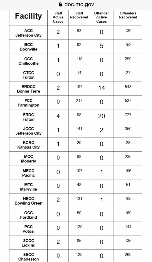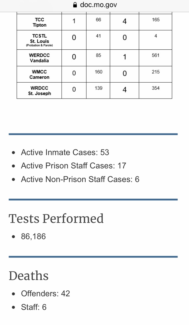 The Department of Corrections just decided to update their COVID-19 numbers after a week. https://doc.mo.gov/media-center/newsroom/covid-19/data