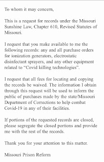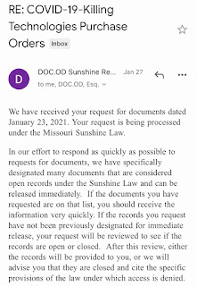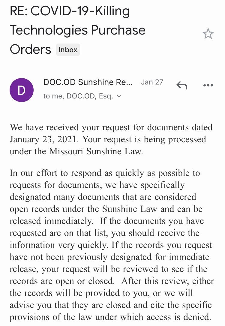 On January 23, 2021 we submitted a sunshine request for the purchase order for the DOC’s “Covid killing technology”. On January 27, 2021 we received a response stating they needed more time to provide these documents. If these “technologies” have been purchased, why does the DOC need so much time to provide the purchase order?