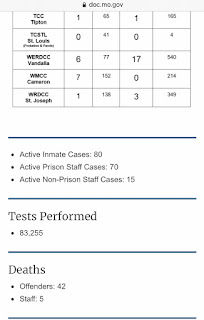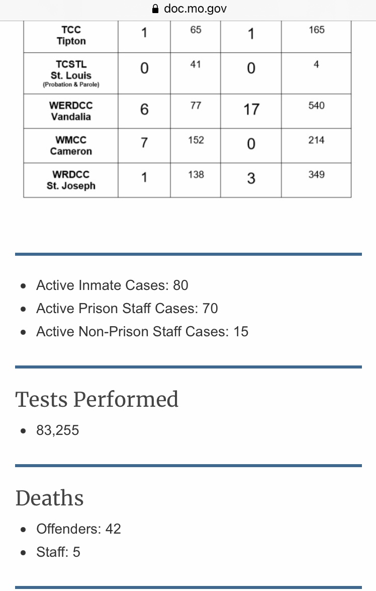 Here’s MoDOC’s Covid-19 data for today. Still no admission to the most recent staff death that took place this week. https://doc.mo.gov/media-center/newsroom/covid-19/data