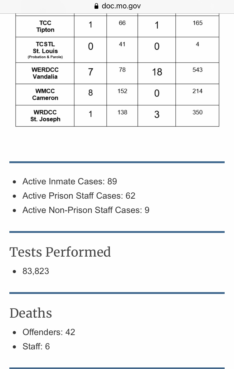 Here’s today’s COVID update for DOC facilities per their website. https://doc.mo.gov/media-center/newsroom/covid-19/data