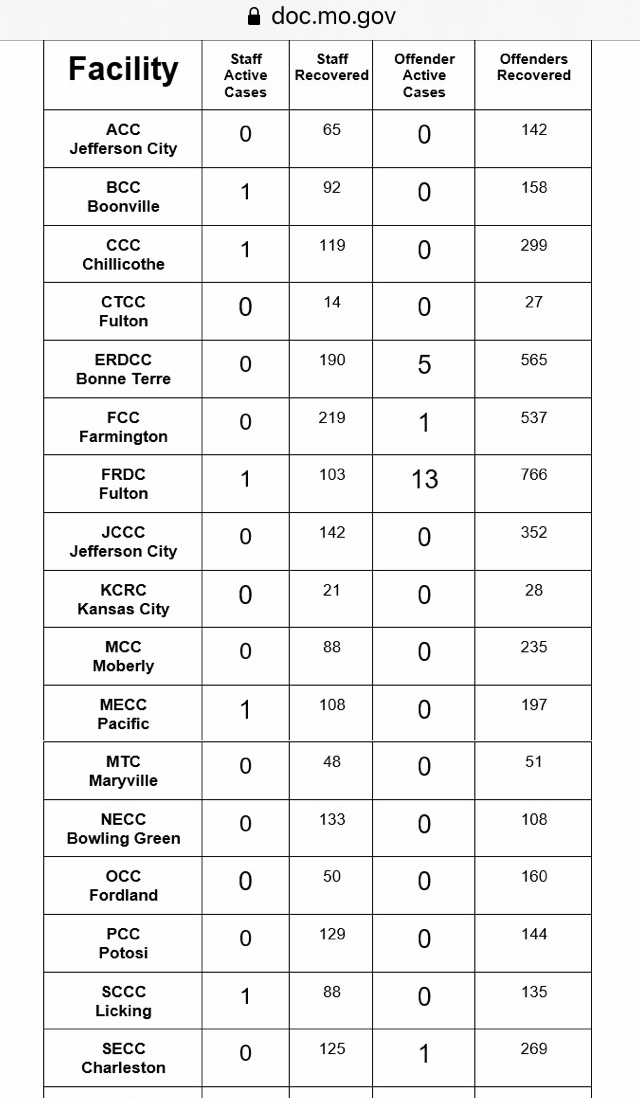 Here’s today’s Covid-19 update per the DOC’s website. https://doc.mo.gov/media-center/newsroom/covid-19/data