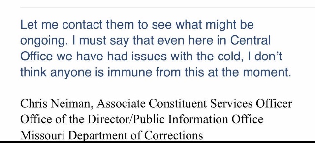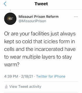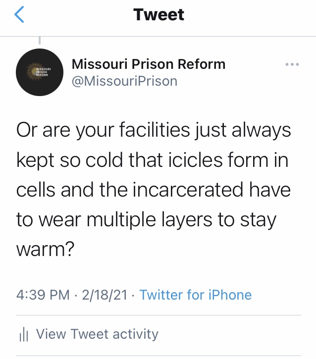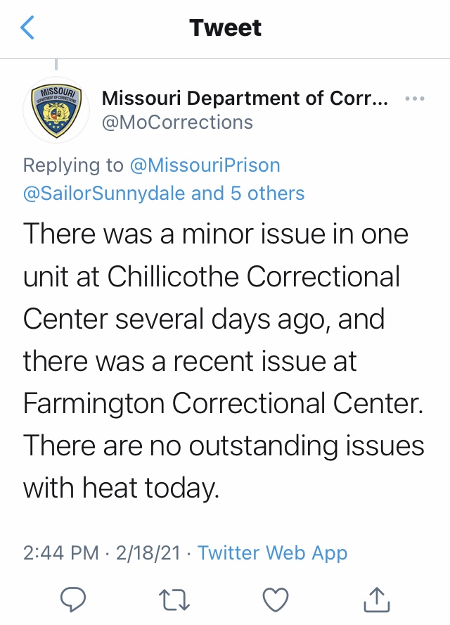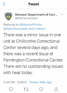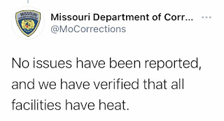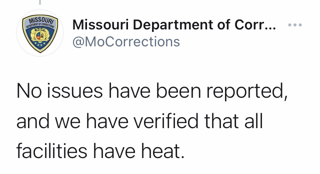 Despite continued issues with freezing temperatures and icicles forming inside cells at several facilities over the past week (and more at FCC), MoDOC took to Twitter yesterday to deny that there were any problems. But this morning Chris Neiman admitted that there are even issues at central office. DOC staff confirmed yesterday that there have been issues with very cold temperatures at several facilities despite what the DOC is telling us.