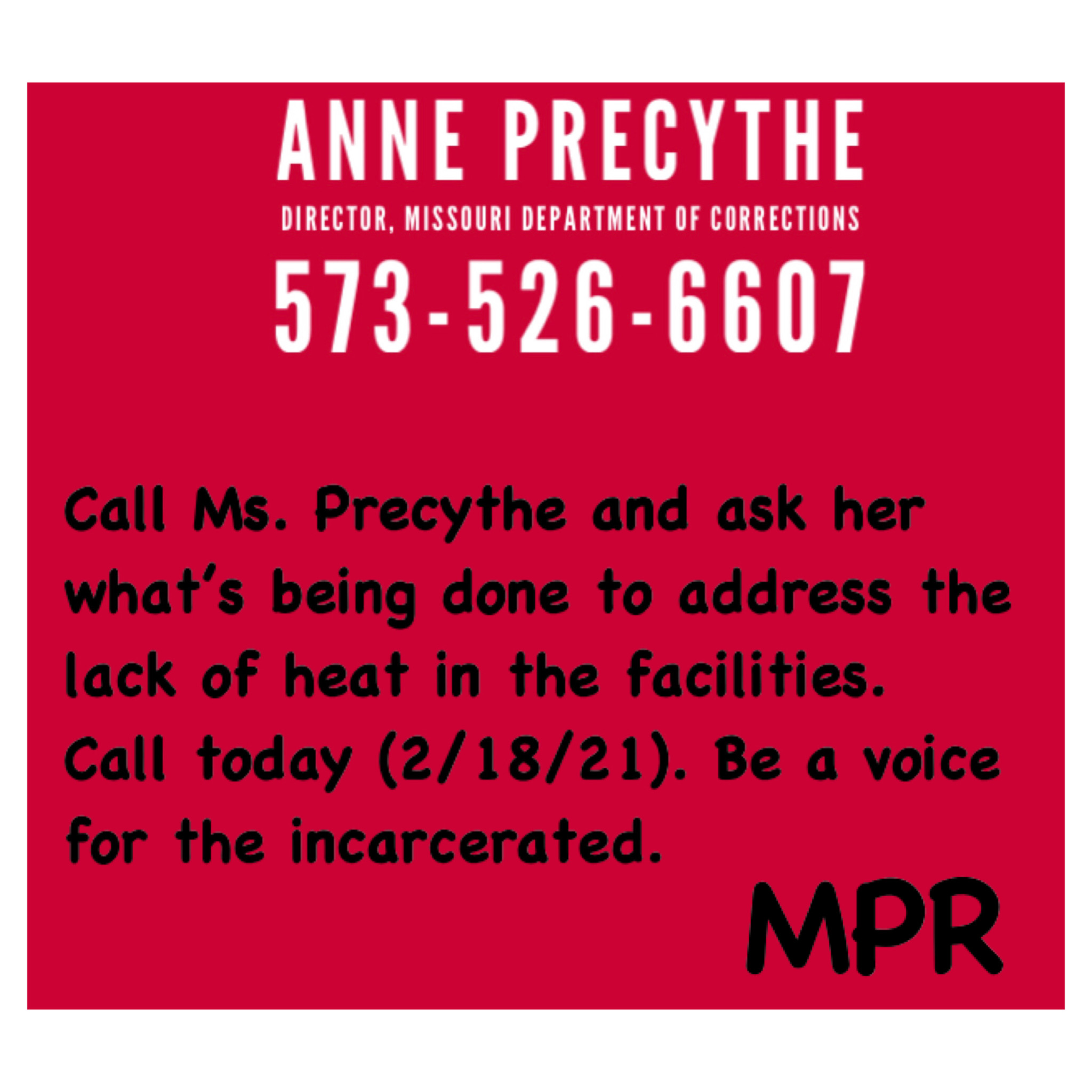 During these extremely cold temperatures, we continue to receive reports of the heat being out at multiple MoDOC facilities as well as power being temporarily out at one facility (generators weren’t working but the power is back on now), and hot water being out at two facilities. Please call Ms. Precythe and demand that these issues be addressed.
