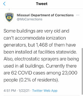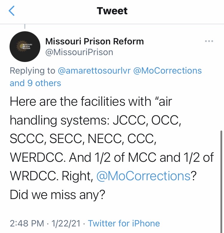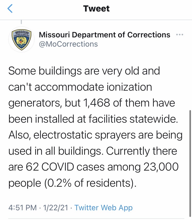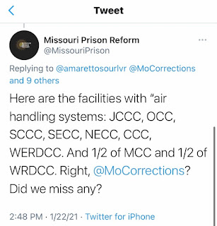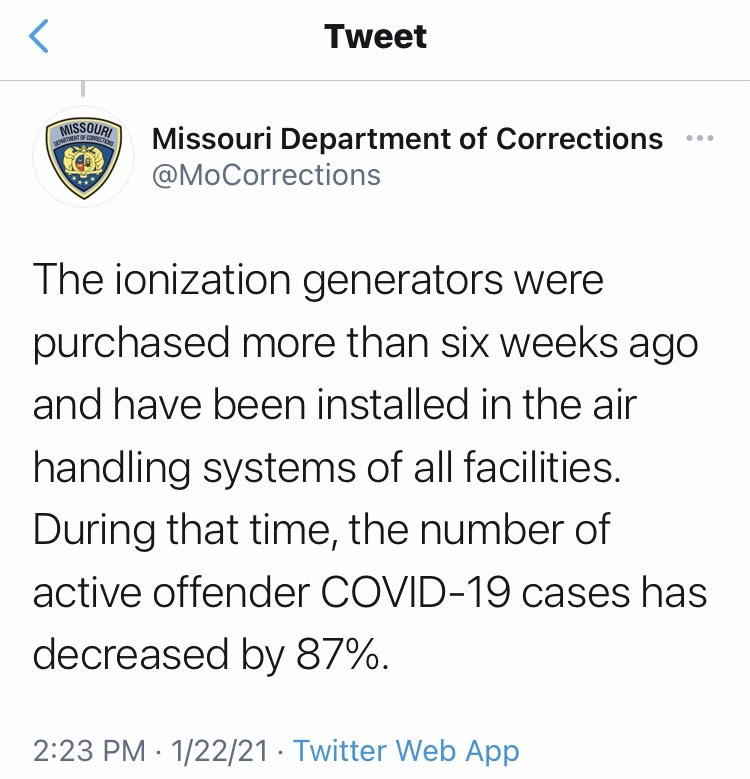 Yesterday afternoon (1/22/21) The Missouri Department of Corrections took to Twitter to address our post regarding their “Covid killing technology”. Of course, they only chose to answer certain questions. The truth is, most of their facilities that house incarcerated individuals do not have “air handling systems” where the incarcerated reside. It’s very misleading of them to tell the public that these air purification systems will be installed at all of their facilities. In one tweet, they state that “some buildings are very old and can’t accommodate ionization generators” but that’s not the full explanation, either. WERDCC in Vandalia is not “very old” and doesn’t have air conditioning. We’ve included screenshots of our conversation with the DOC. We want truth and transparency from the Missouri Department of Corrections. We’ll also be doing some sunshine requests regarding this issue.