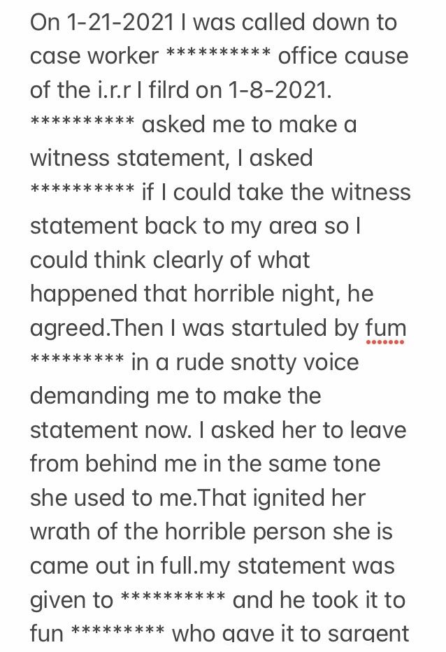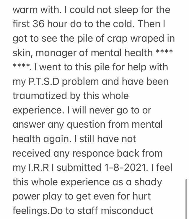 This is a message we received from the incarcerated man who filed the IRR (Informal Resolution Request) regarding the way staff handled the riot on New Year’s Eve at Maryville Treatment Center. In his IRR he stated he felt unsafe that night due to the way staff handled things. This was shared with his permission.